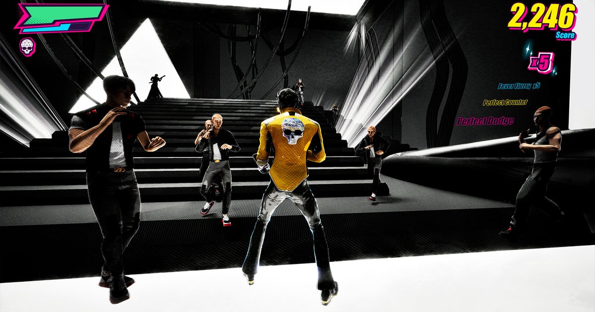 Esistono due tipi di finisher. Due. Una può essere eseguita subito prima di un attacco per contrastare e un’altra può essere eseguita subito dopo una schivata. Ognuna di esse mostra più attività fisica di quanta ne abbia svolta quest’anno, messa insieme. Ma puoi continuare a farli. Questo è il potere della discoteca. Inoltre, i tuoi nemici ballano quando inizia la fase. Inoltre, in uno degli stage ci sono dei treni pericolosi. Sentire parlare di treni pericolosi ti fa venire fame? È comprensibile. Ecco il menu delle caratteristiche.