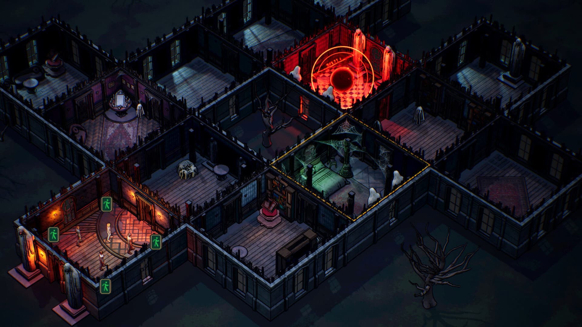 Durante il giorno espandi il tuo layout, pensando a quali stanze sono più adatte a erodere la sanità mentale dei tuoi visitatori. Costruisci un campanile, ad esempio, e avrai una strega spettrale che si aggira nei tuoi corridoi. Inoltre, puoi schiacciare le persone con la campana, il che è un bel bonus sanguinoso.