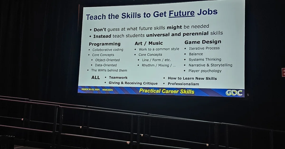 Il discorso completo, ovviamente, entra più nello specifico e per i dettagli più precisi ti consigliamo di guardare il video quando verrà lanciato su GDC Vault. Ma una delle lezioni più importanti è che, sebbene il settore sia attualmente un posto instabile e avrà sempre più persone che posti di lavoro, ci sono ragioni per avere speranza. L’equilibrio tra vita privata e lavoro sta migliorando, l’industria stessa sta crescendo e soprattutto le tue competenze sono trasferibili: la programmazione e l’informatica trovano applicazione in quasi tutti i settori; l’arte digitale è utilizzabile in aree come il design dei prodotti, la pubblicità e il marketing; la produzione e lo sviluppo insegnano buone capacità manageriali e umane; il design dell’esperienza può essere applicato al layout di spazi come musei, parchi a tema e negozi. Questi sono solo alcuni esempi di come la tua disciplina possa essere estesa all’esterno. E se non puoi applicare le tue conoscenze a un nuovo campo, considera che le competenze trasversali possono aiutare l’occupazione, soprattutto quando fai domanda in piccole aziende. Il programma di game design della MSU ha un tasso di occupazione post-laurea del 90% proprio perché prevede questi fattori.